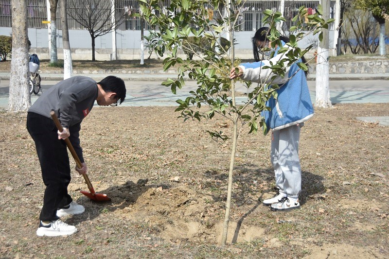 植树现场,参加活动的学生热情洋溢、干劲十足。同学们两三人一组,相互协作,配合默契,扶苗、铲土、填坑、浇水,忙碌的身影呈现出一派热火朝天的景象。同学们还在树苗上挂上小木牌并写上祝福语,并互相分享各自本次活动的感悟。此次活动共种下24株桂花树苗,为校园增添了一片新绿。