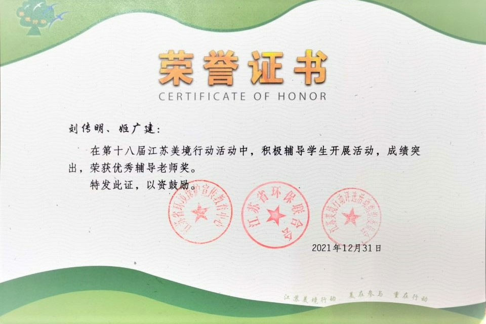 由江苏省环境保护宣传教育中心、江苏省环保联合会、江苏省能源研究会和江苏绿色之友共同举办的江苏美境行动第十八届揭晓暨第十九届启动仪式于12月31日在线上举行。经过激烈角逐,伍豪环保先锋社“绽放生命之色彩,坚守里运之魅力”项目荣获“优秀方案设计奖”、“优秀方案实施二等奖”,指导老师刘传明、姬广建荣获“优秀辅导老师奖”,除此之外刘传明还荣获“伯乐奖”。