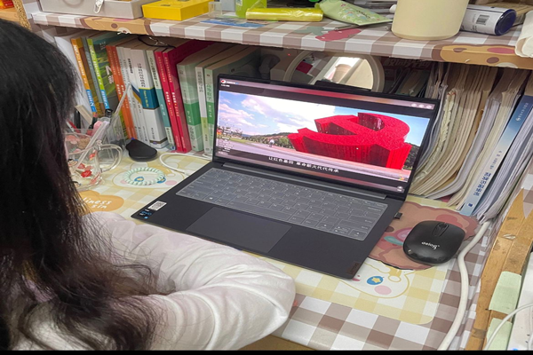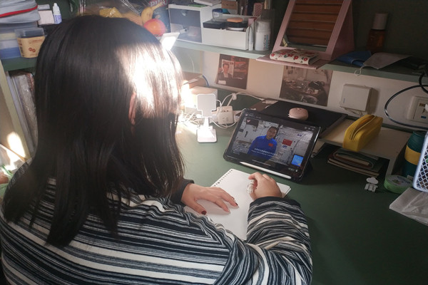 图为宋巧巧观看直播。记者 王颖 摄
