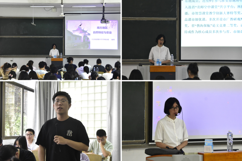 在“名师示范”环节,淮阴中学开明分校杨琴老师和淮安清江中学李凤梅老师分别讲授《南方地区的自然特征与农业》和《多维透视海水性质和海气相互作用》两节中学地理示范课。两位教师现场还原真实课堂教学情境,通过精彩的授课展示、互动交流和教学总结,为师范生提供了具体、生动的教学示范与参考。