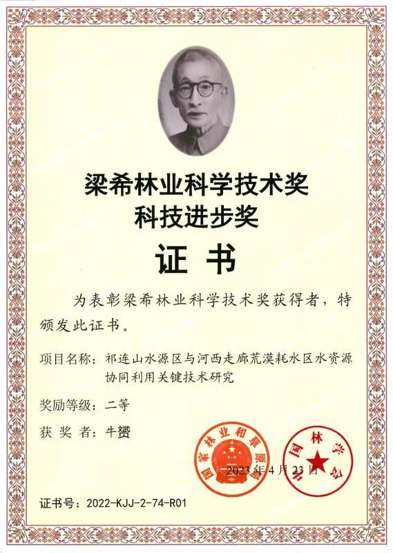 日前,中国林学会公布了第十三届国家林草局梁希林业科学技术奖评选结果,由城市与环境学院牛赟教授主持的科研项目《祁连山水源区与河西走廊荒漠耗水区水资源协同利用关键技术研究》喜获国家林草局梁希林业科技进步二等奖。