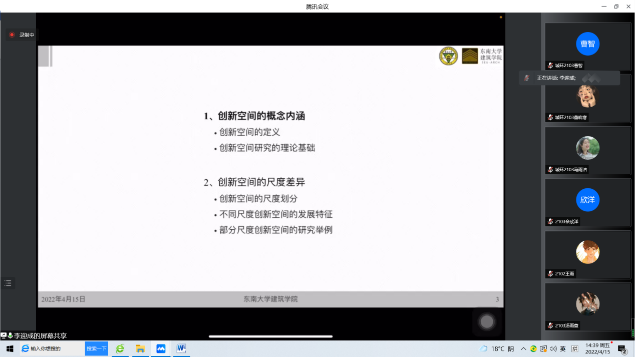 4月15日14:30-17:30,东南大学建筑学院李迎成教授应邀做客第43期淮河论坛,并作题为《创新空间的概念内涵与尺度差异》的学术报告。本次学术报告采用腾讯会议线上模式,城环学院院长毛广雄主持,学院部分师生参会。