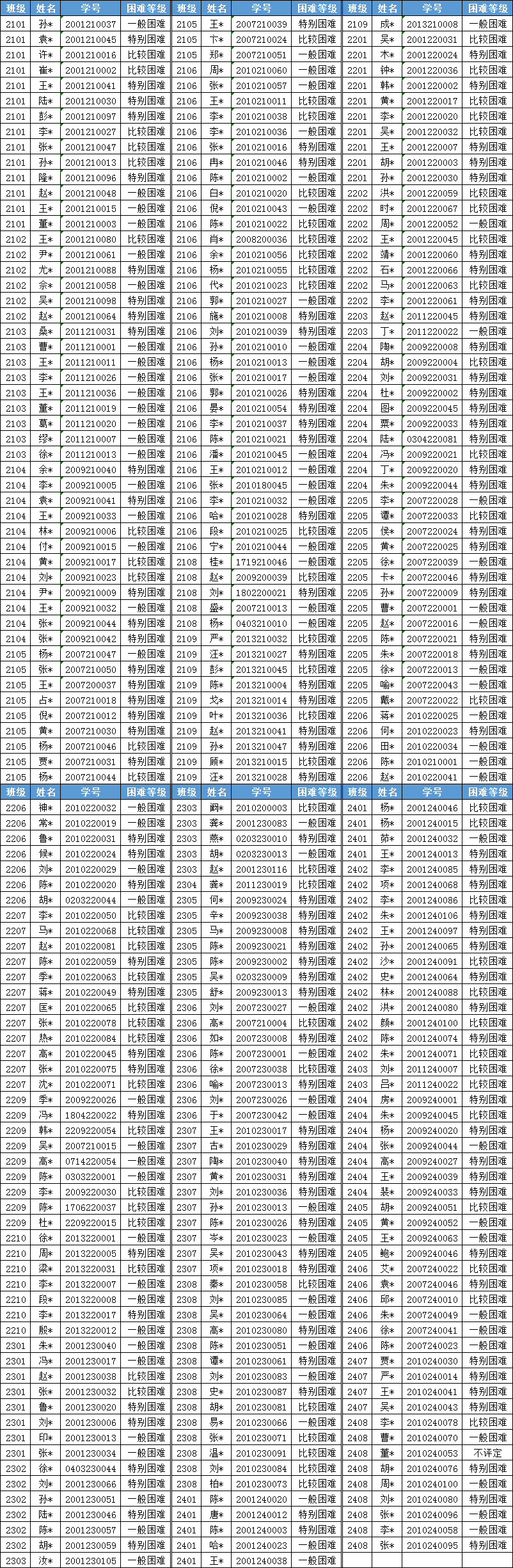 根据学生个人申请,班级民主评议,学院审核,现对本次家庭经济困学生名单予以公示,详细名单如下: